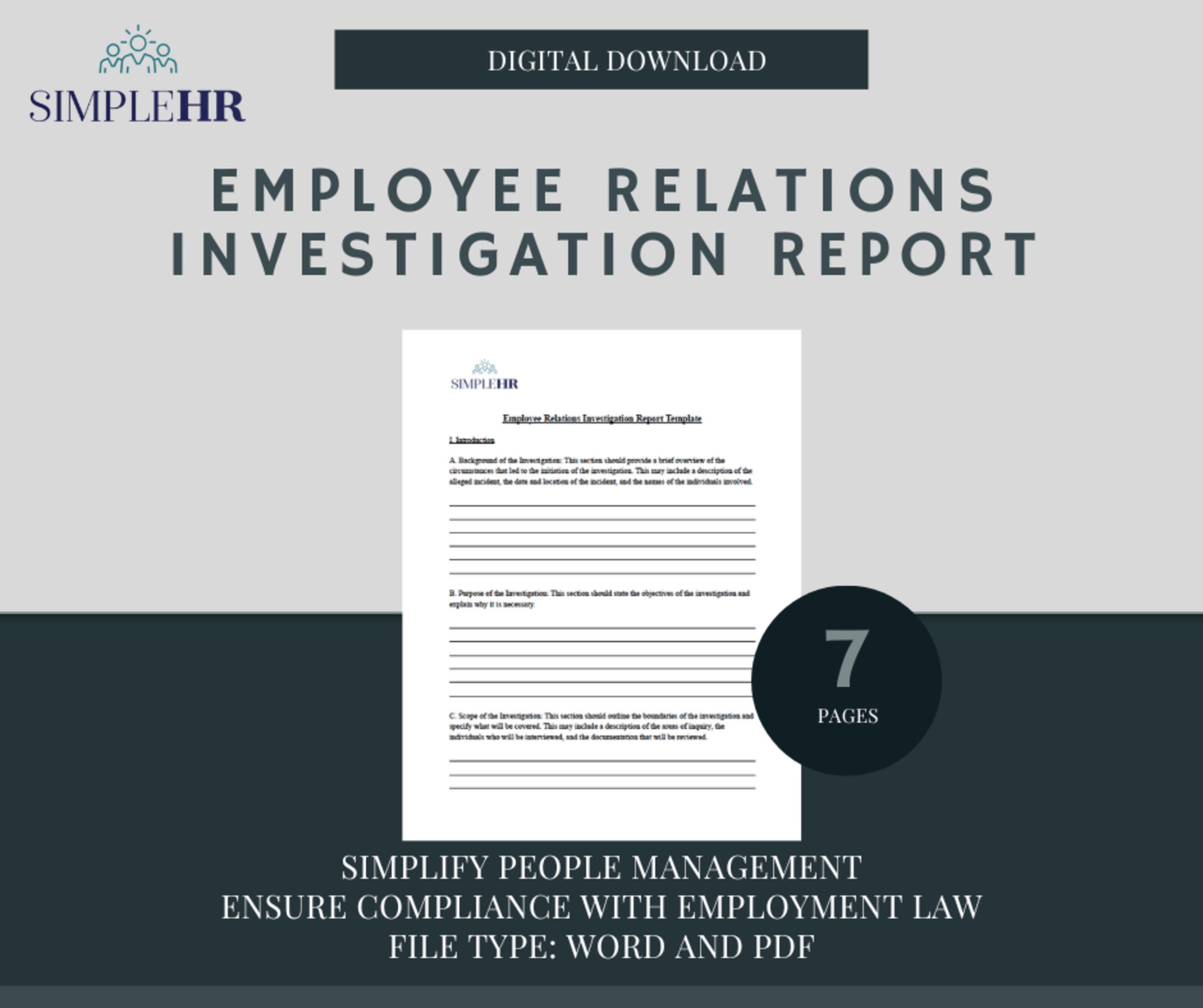 Looking for a comprehensive and professional template to conduct thorough employee relations investigations? Our Employee Relations Investigation Report Template provides a complete solution for investigating workplace incidents and resolving employee conflicts. Designed for HR professionals, managers, and internal investigators, this template covers all the essential elements of an effective investigation, including background information, methodology, findings, recommendations, legal considerations, best practices, confidentiality, and a signature page.
